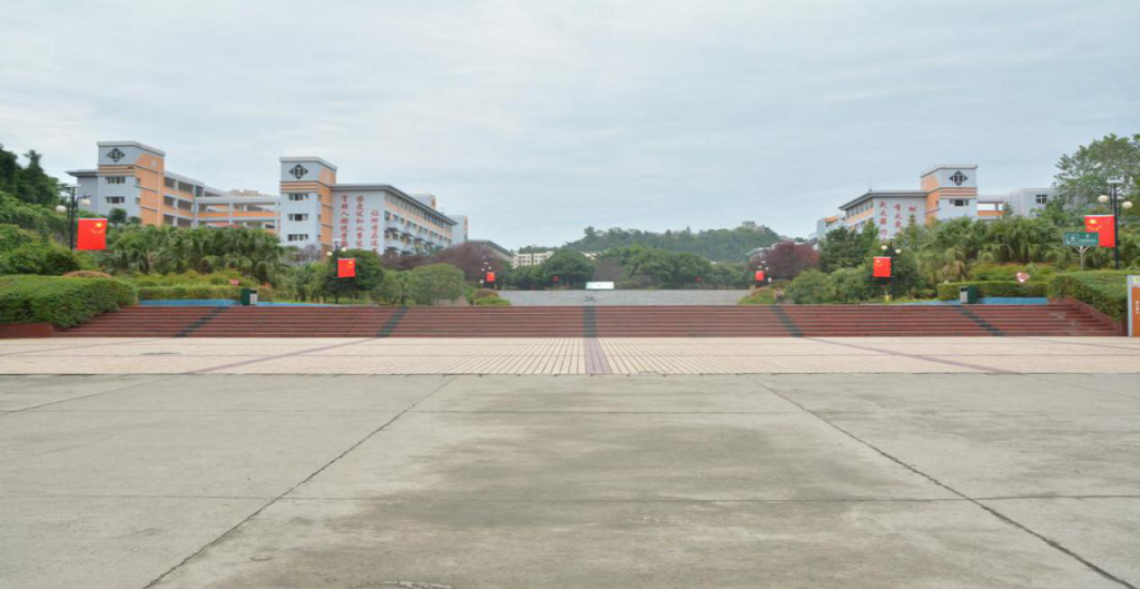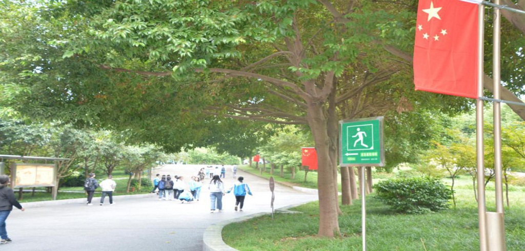 五星红旗整齐地排列在校门上方,悬挂在绿树葱茏校园通道两侧,鲜艳的中国红辉映着蓝天白云和绿树高楼,整个校园笼罩在一派喜庆热烈的节日气氛中。