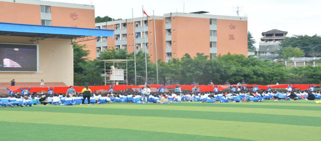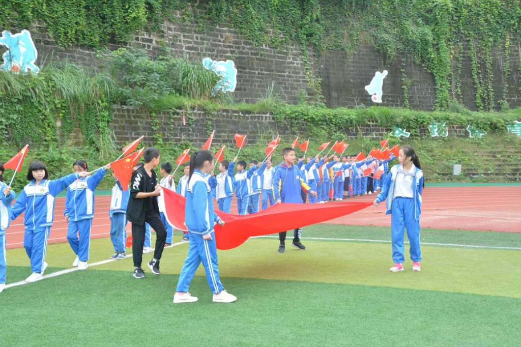 足球场上,歌声嘹亮,红旗翻飞。少年学子们在雄壮高亢的歌声中,或护旗列队,或抬旗奔跑,严整有序,热闹非常。