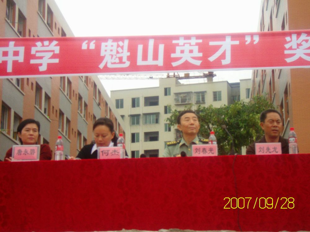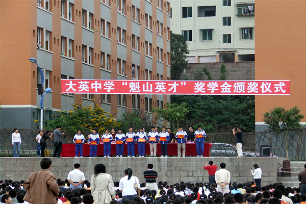 大英中学"魁山英才"奖学金颁奖仪式2007年9月28日在学校足球场隆重举行.刘春光先生亲临会场,漆青先生因洽谈业务未参会,何洁同志与会并发表了重要讲话.学校领导全部出席了颁奖仪式,并给获奖的十名同学颁发了奖学金,每位同学2000元.