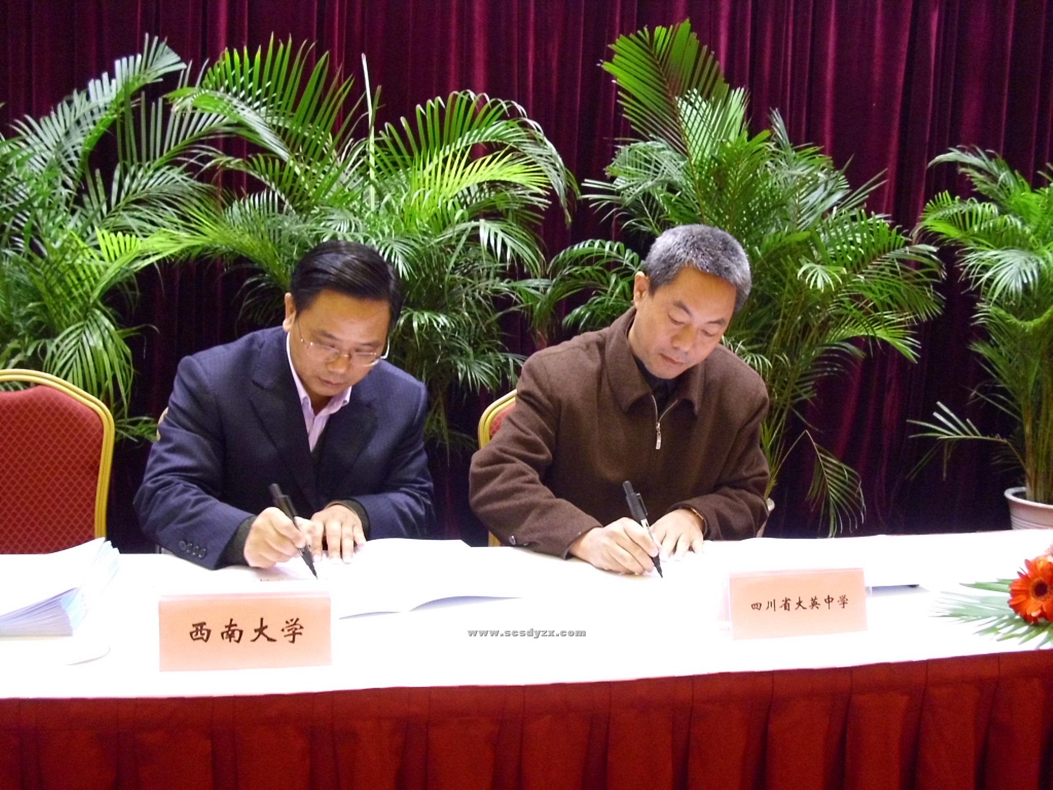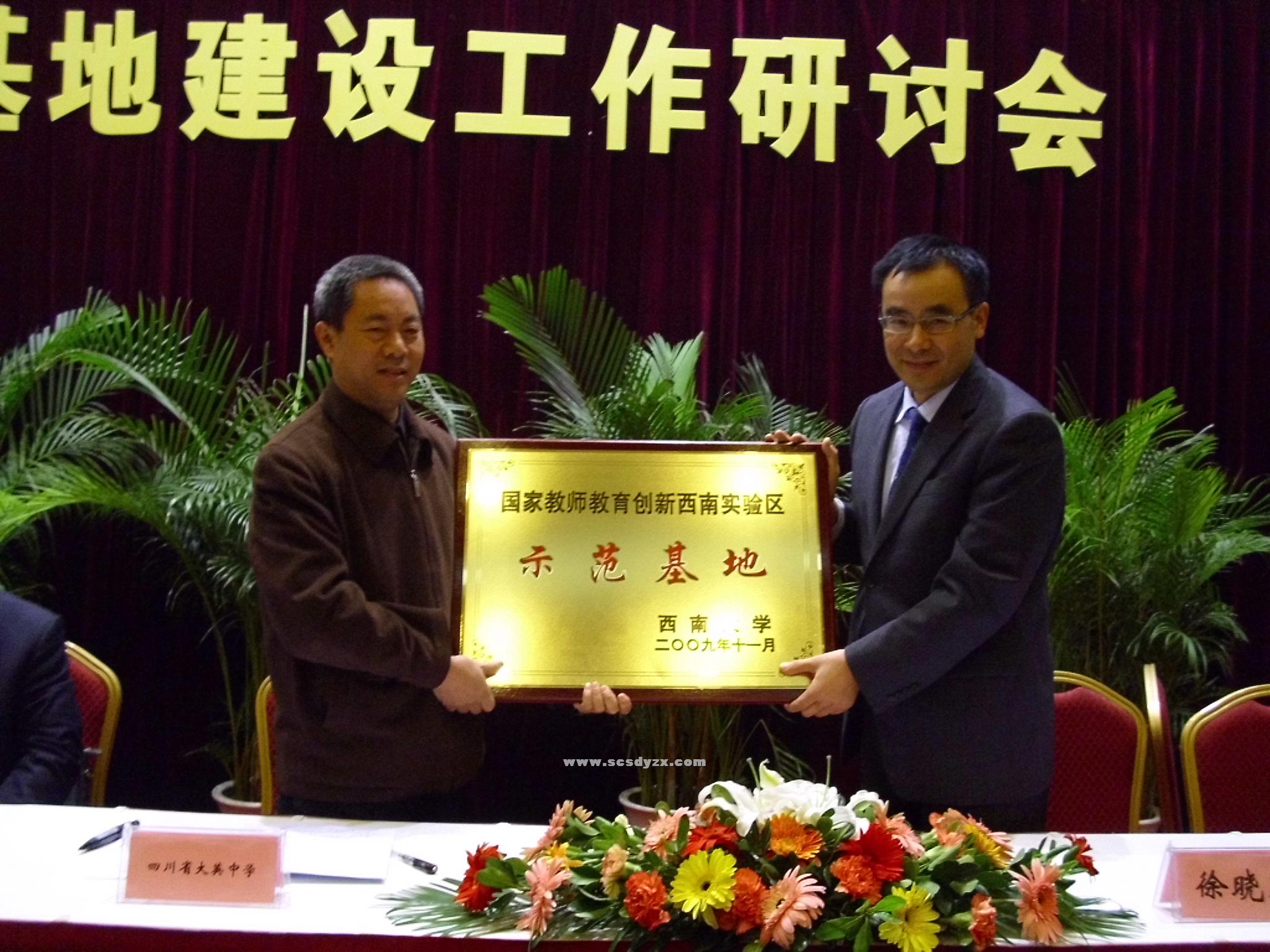 2009年11月15日,学校党总支书记、校长刘先龙和教科室副主任蒋爱民等同志参加了“西南大学国家教师教育创新西南实验区与示范基地建设工作研讨会”。研讨会上,校长刘先龙同志代表大英中学与西南大学签订了《西南大学大英中学共建国家教师教育刨新西南实验区示范基地合作协议书》。会议由西南大学教务处处长周光明主持,西南大学党委副书记徐晓黎致欢迎辞。