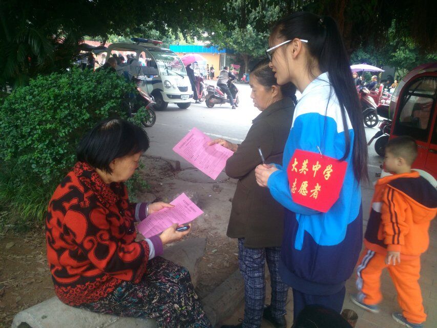 为推动结核病防止常态化、规范化、大众化,广泛发动师生参与结核病知识宣传,20179月以来,大英中学青年志愿者协会组织多次志愿者活动,深入街道、社区、广场开展宣传工作,展现了大中人爱公益,乐奉献的良好风貌。